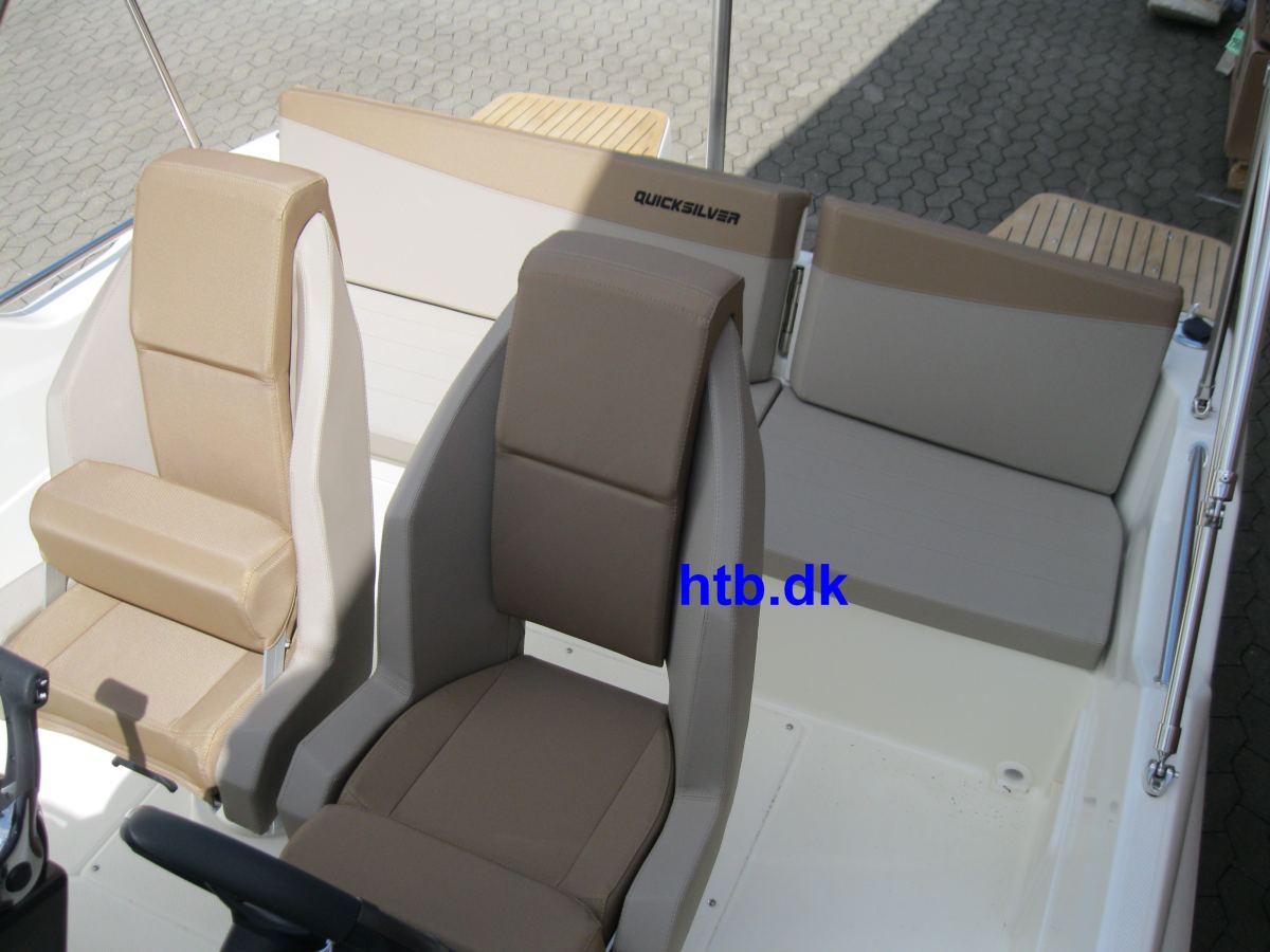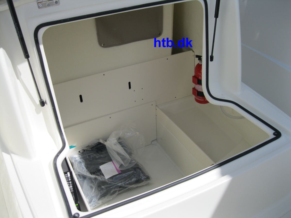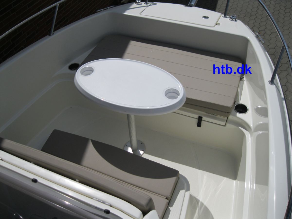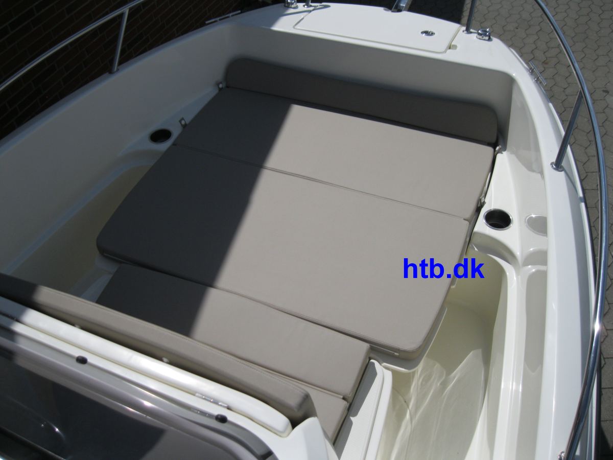 Farvet gelcoat, badeplatformudvidelse m/Flexi teak, heldækkende transportkaleche, SmartPack m/bimini, vandskistang/øje, Fusion stereoanlæg med 2 højtalere, cockpit bruser, stævnkit m/solindsats og hynder i stævn samt bord og fortøjningssæt