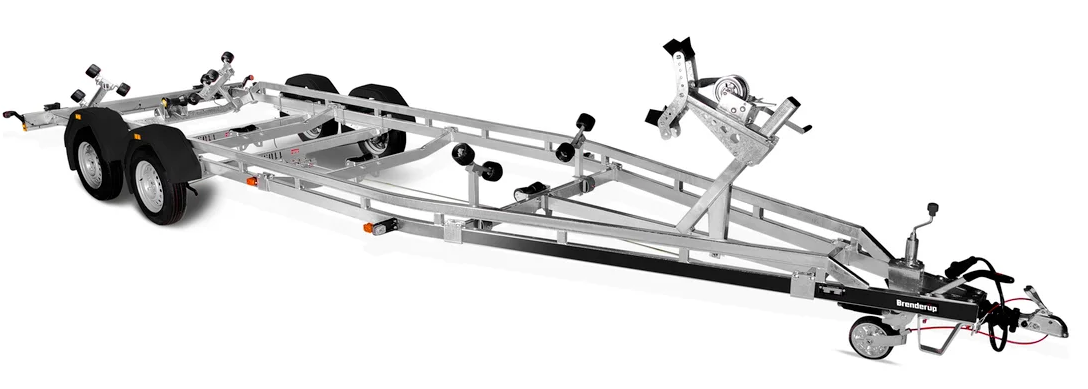 Bremset trailer med to aksler til både op til 22 fod. Traileren er udstyret med et forstærket V-formet chassis. Udstyret med superruller, forstærkede kølruller og justerbare dobbelte sideruller, som gør det nemt for dig at tilpasse traileren til din båd. Varmgalvaniseret chassis og vandtætte lejer for længere levetid og maksimal beskyttelse mod rust. Kablerne ligger beskyttet i trailerens chassis. Justerbart spil og spiltårn. Lystavlen sikrer let og hurtig søsætning af din båd, og lystavlen kan opbevares i bilens bagagerum under sejlturen. Traileren på billedet kan være vist med ekstraudstyr.