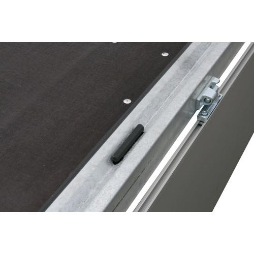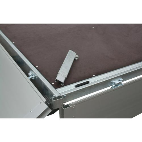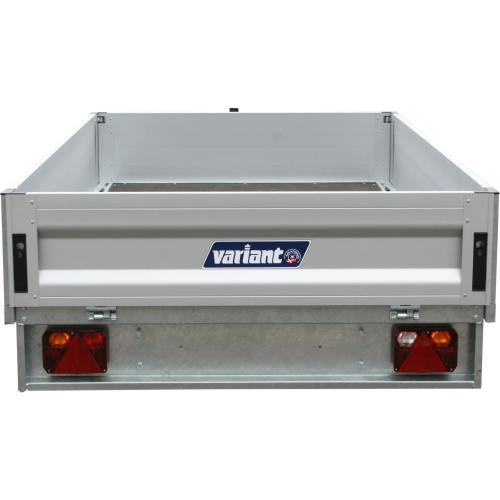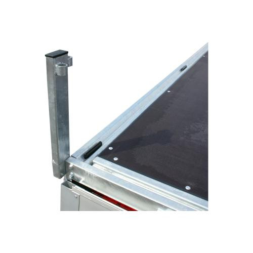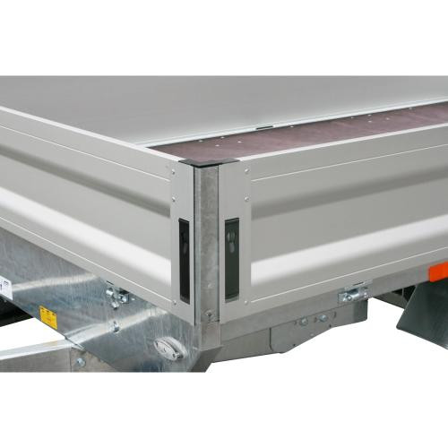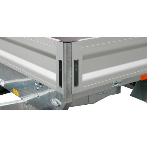 M/alusider som er nedfældelige og aftagelige og med aftagelige hjørnestolper. Siderne er med integrerede lukketøjer og surringsøjer nedfældet i bunden.